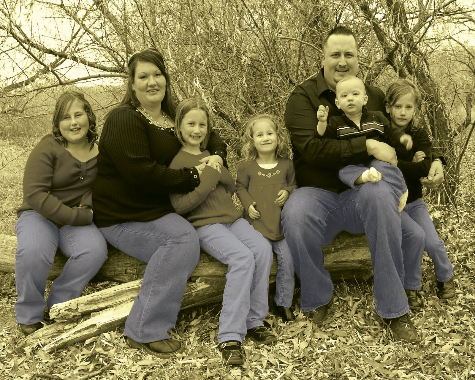 Another way to replace color in Photoshop is to desaturate your photo, and choose your paintbrush, then your color, and very carefully and precisely paint the photo, where you want the color to be. I have an example below of a family picture I took of a friends family. I changed the photo to Sepia, then I repainted their jeans blue. The trick is, you have to change the opacity on your brush. Make sure you start a brand new layer, only for your painting. Change the opacity on that particular layer.